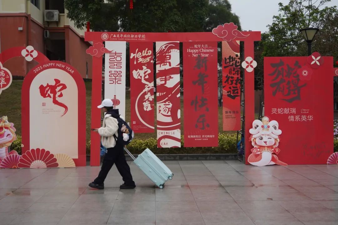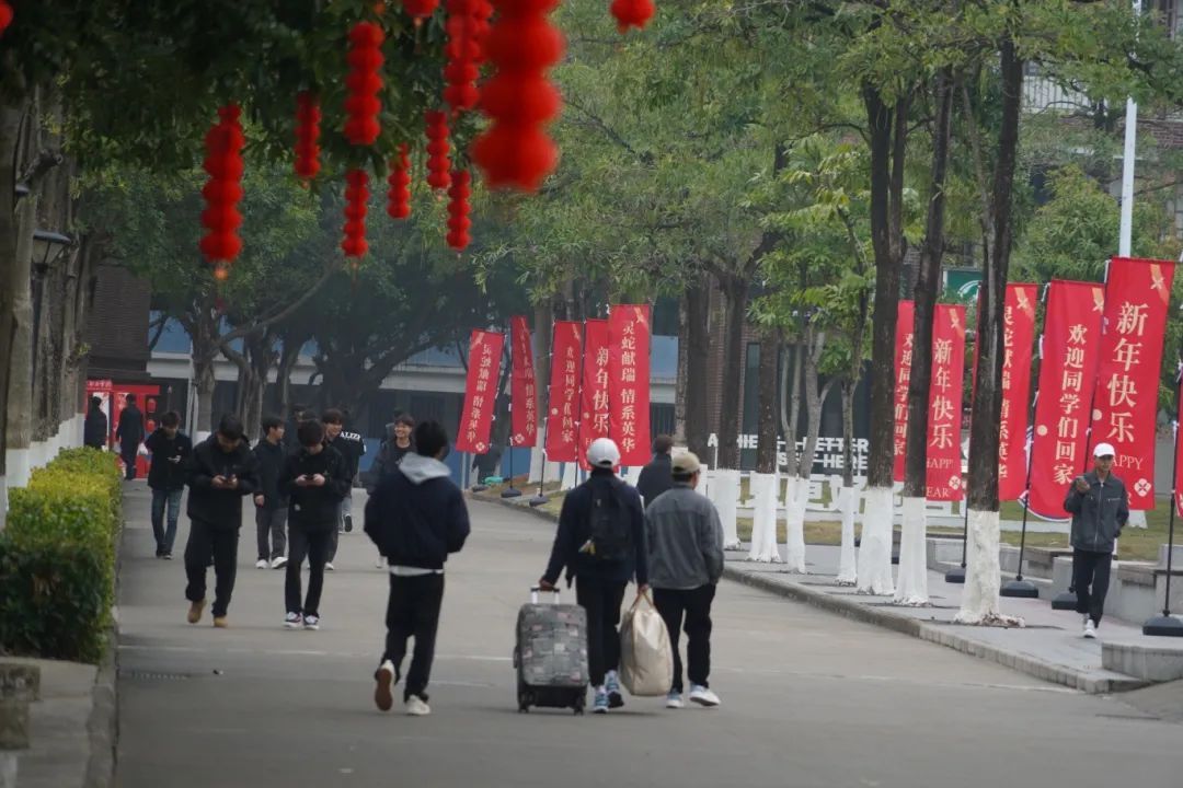 踏入校門的那一刻,新春紅色為主色調(diào)的裝飾在陰雨中顯得格外醒目。廣場上高大的新春立牌,傳統(tǒng)吉祥圖案在雨幕中若隱若現(xiàn),傳遞著新春的美好祈愿。校道旁的道旗在微風(fēng)中輕輕擺動,紅色旗幟上寫著“歡迎同學(xué)們回家”“新年快樂”“靈蛇獻(xiàn)瑞,情系英華”等字樣,傳遞著學(xué)校對同學(xué)們深深的思念與祝福。