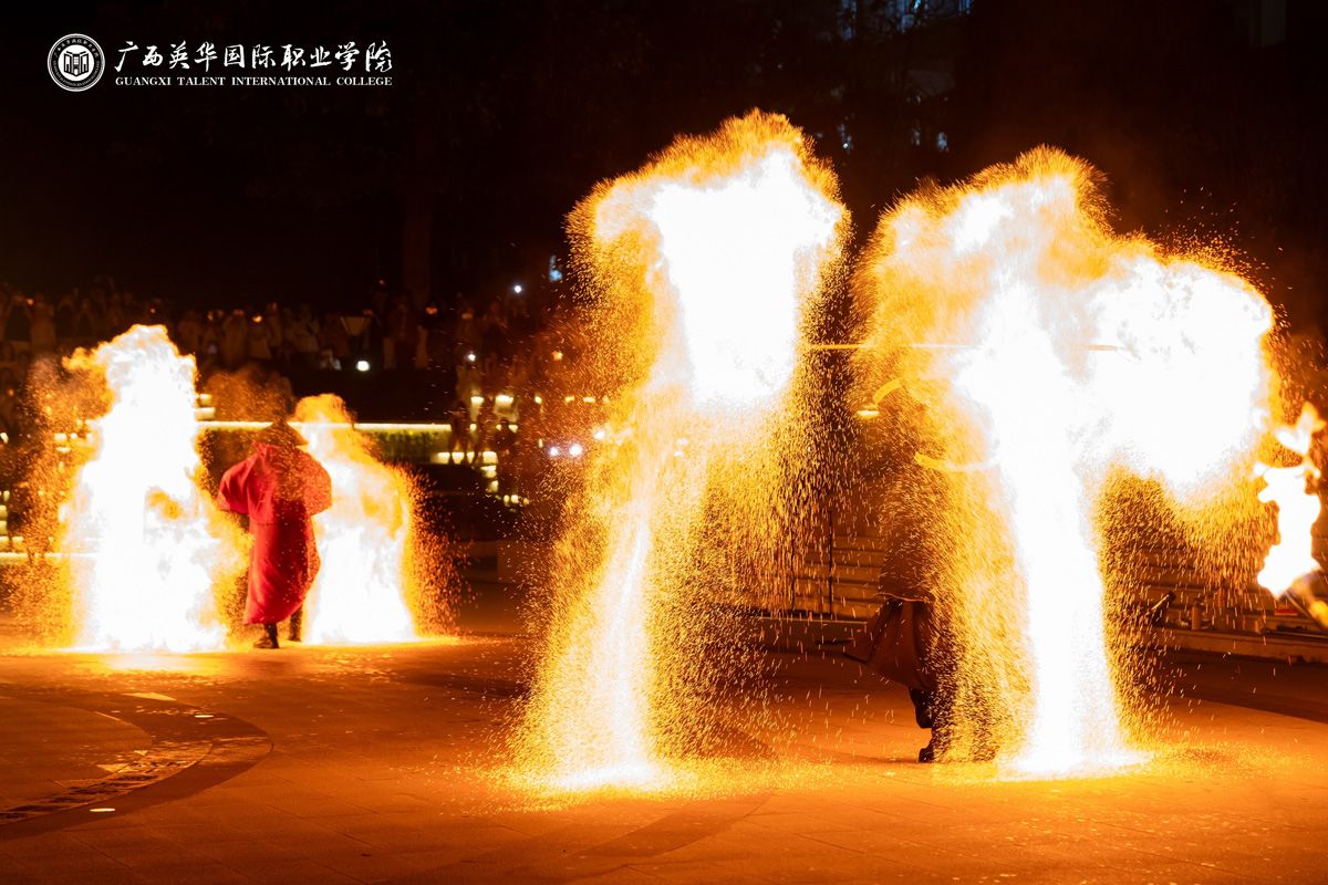 當(dāng)夜幕降臨,一場絢麗的“打鐵花”表演驚艷全場。只見鐵水被高高拋起,瞬間在空中綻放,化作萬千星火,如流星般劃過夜空,照亮了整個魔方廣場。這璀璨的鐵花不僅點亮了黑夜,更在師生們心中種下了傳承非遺文化的種子。