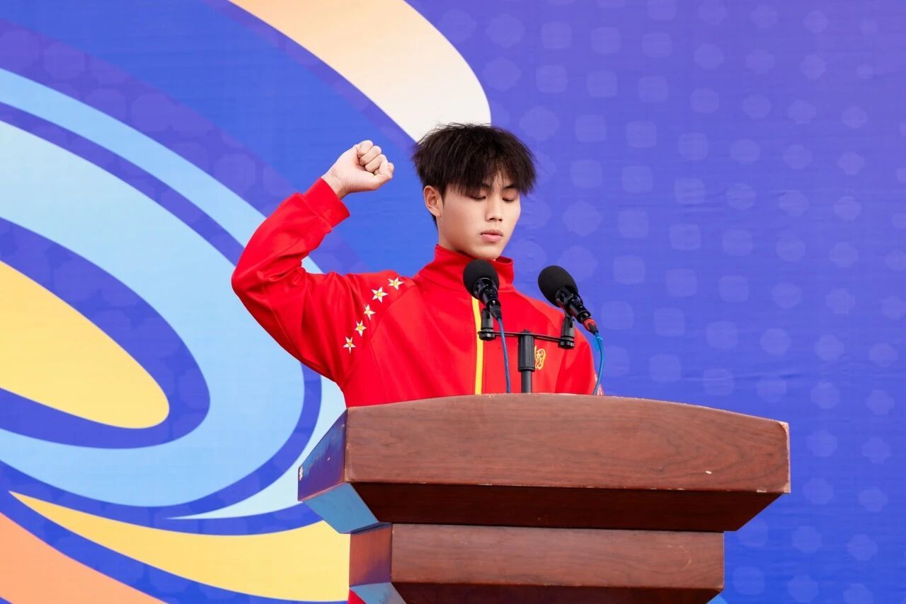運(yùn)動員代表與裁判員代表依次登臺宣誓。2025 級社會體育專業(yè)吳佾洧同學(xué)作為運(yùn)動員代表,承諾將秉持體育精神,奮勇拼搏、尊重對手、遵守規(guī)則;通識教育學(xué)院林國鋒老師作為裁判員代表,表態(tài)將以專業(yè)嚴(yán)謹(jǐn)?shù)膽B(tài)度公正執(zhí)裁,守護(hù)賽事公平。字字鏗鏘有力,既傳遞了對體育精神的敬畏,也彰顯了對公平競賽的堅守,更飽含著對本屆盛會的美好期待。