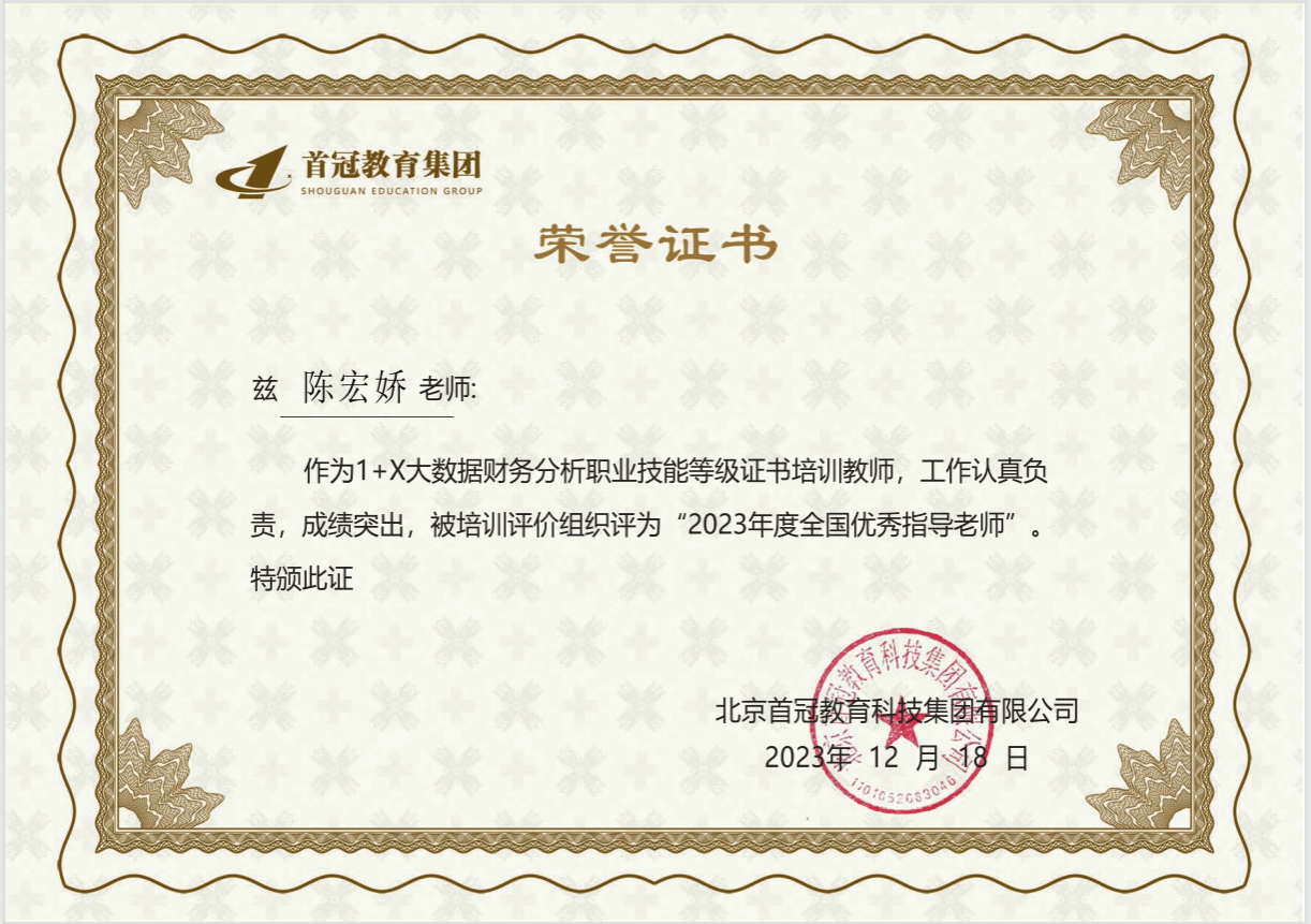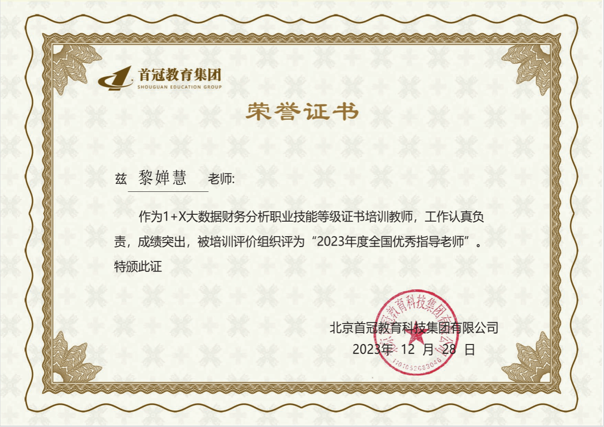 近日,廣西英華國際職業(yè)學(xué)院在北京首冠教育1+X大數(shù)據(jù)財務(wù)分析職業(yè)技能等級證書實施過程中,積極有序推進(jìn)試點單位工作,實施高質(zhì)量職業(yè)培訓(xùn),被評為2023年度“全國實施標(biāo)桿院校”。