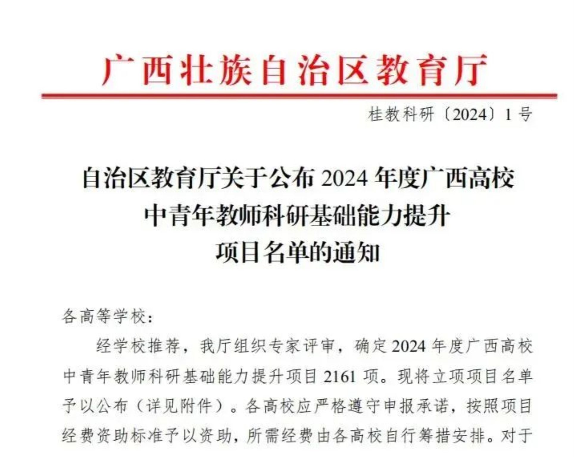 近日,自治區(qū)教育廳公布了2024年度廣西高校中青年教師科研基礎(chǔ)能力提升項(xiàng)目名單。廣西英華國際職業(yè)學(xué)院推選了19項(xiàng)課題,成功獲批立項(xiàng)18項(xiàng),涵蓋了教育、醫(yī)學(xué)、社會(huì)科學(xué)、信息技術(shù)等多個(gè)學(xué)科領(lǐng)域,充分彰顯了學(xué)校在科研領(lǐng)域的實(shí)力與優(yōu)秀成就。