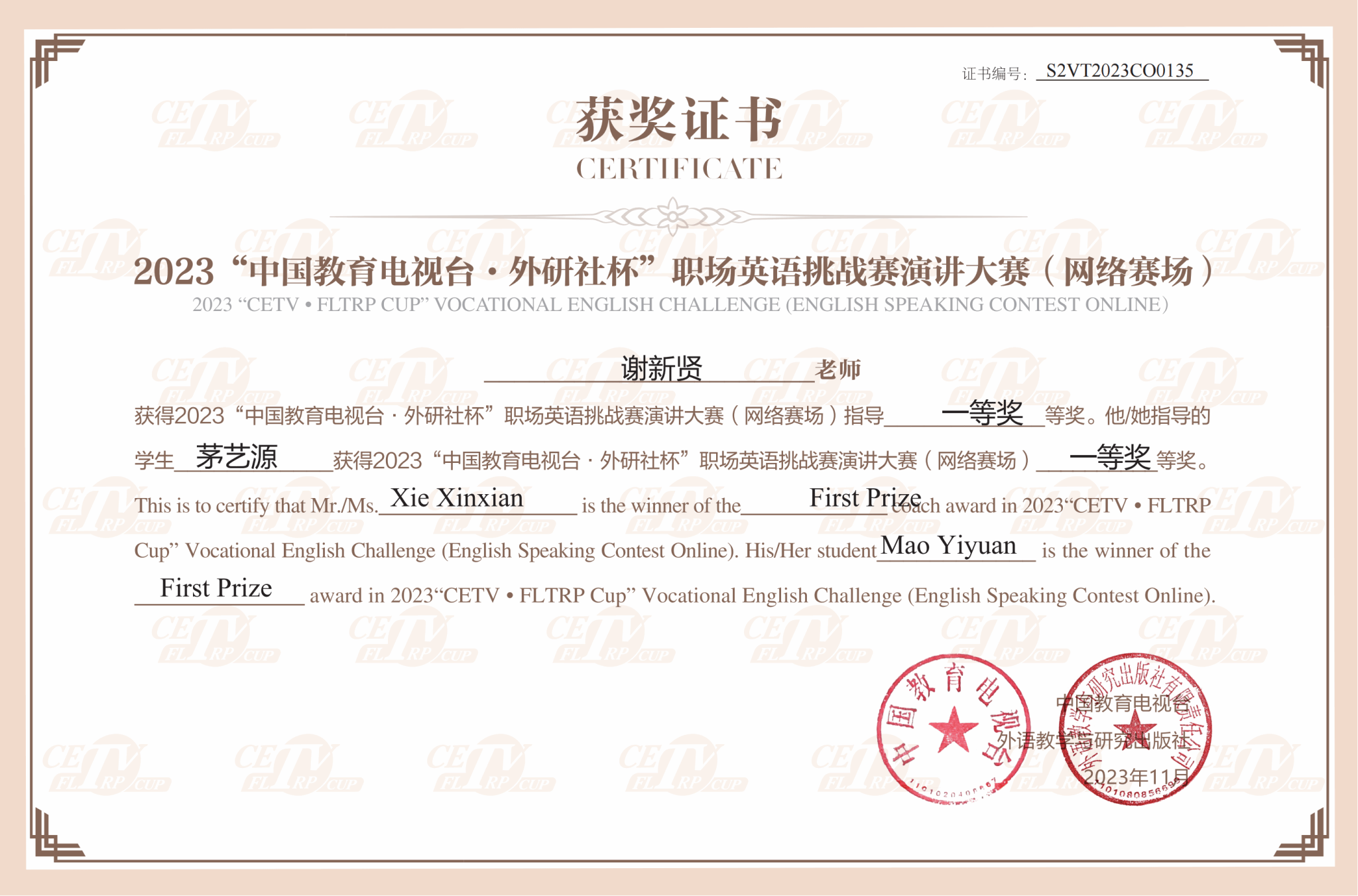 2023“中國(guó)教育電視臺(tái)·外研社杯”職場(chǎng)英語(yǔ)挑戰(zhàn)賽演講比賽在今日落下帷幕。我校謝新賢、勞家朗老師指導(dǎo)的五位同學(xué),經(jīng)過(guò)激烈角逐,在選手中脫穎而出,榮獲省級(jí)一等獎(jiǎng)1項(xiàng),二等獎(jiǎng)4項(xiàng),三等獎(jiǎng)2項(xiàng),展現(xiàn)了出色的口才與英語(yǔ)演講才能。