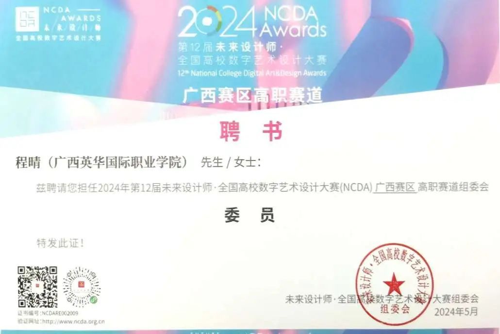 此外,我校程晴老師首次榮任米蘭設計周的評委一職,這不僅是對她個人專業(yè)能力的認可,更標志著廣西英華國際職業(yè)學院在學科競賽領域的參與度邁上嶄新高度。
