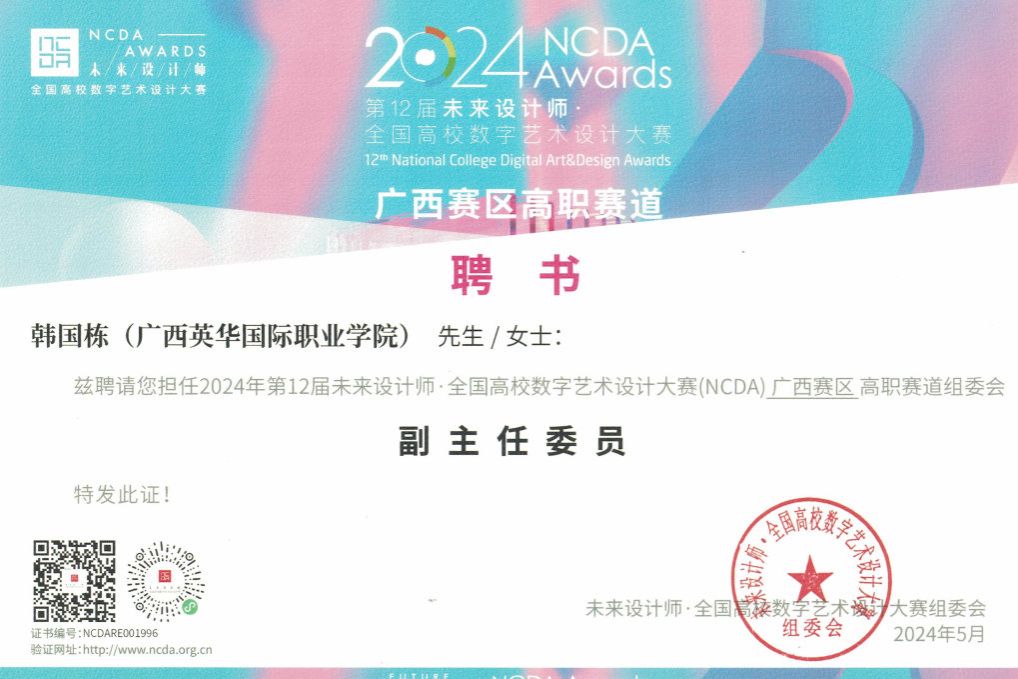 儀式上,廣西英華國際職業(yè)學院建筑與設計學院院長韓國棟被聘為廣西賽區(qū)高職賽道組委會副主任委員,程晴副教授被聘為廣西賽區(qū)高職賽道組委會委員,這是我校在該賽項上首次擔任組委會成員。