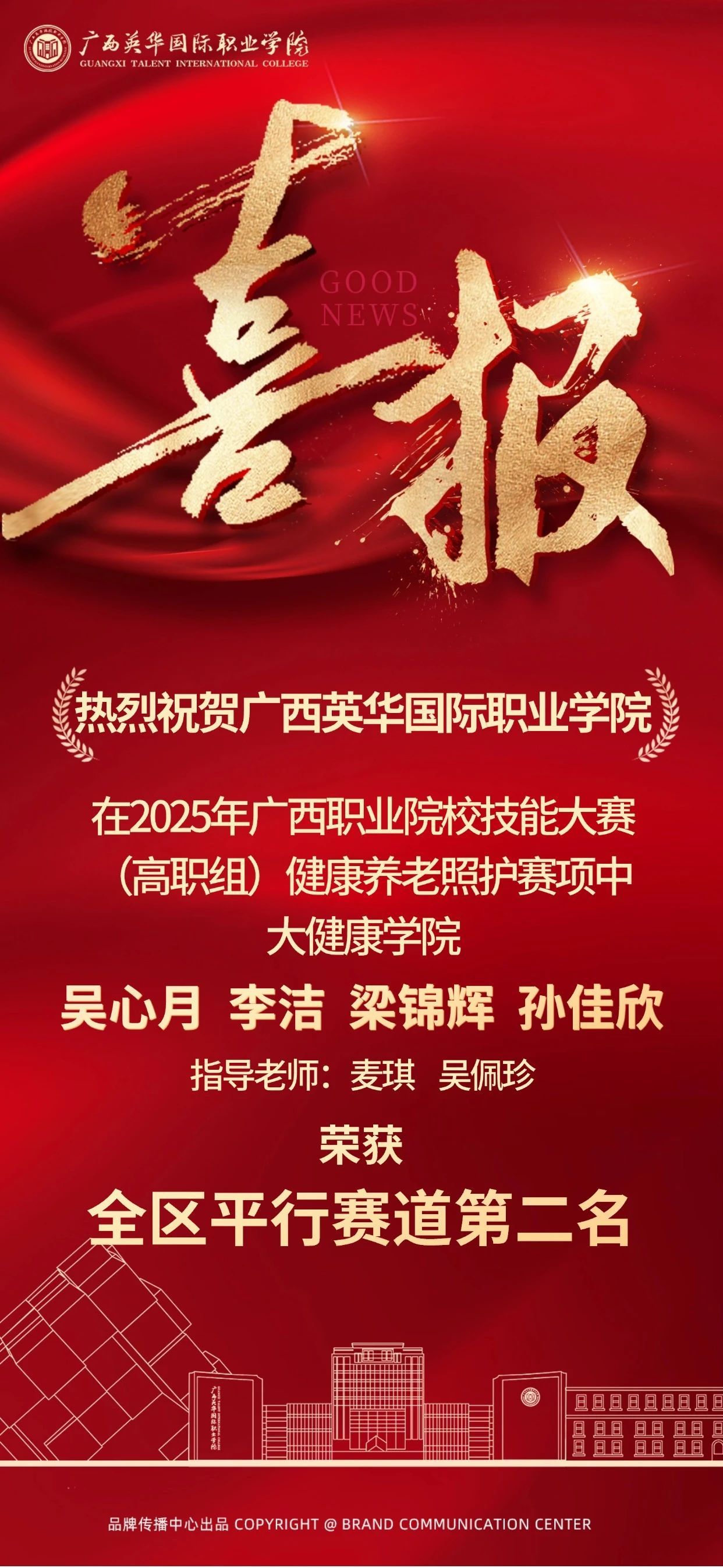 廣西英華國際職業(yè)學院大健康學院一直致力于培養(yǎng)高素質的健康養(yǎng)老照護專業(yè)人才,此次獲獎不僅是學院教學成果的有力體現,也是對學院人才培養(yǎng)模式的充分認可。未來,學校將以此次大賽為契機,繼續(xù)深化教學改革,優(yōu)化課程體系,提升人才培養(yǎng)質量,為健康養(yǎng)老事業(yè)輸送更多專業(yè)能力強、綜合素質高的優(yōu)秀人才,助力健康養(yǎng)老行業(yè)的發(fā)展。