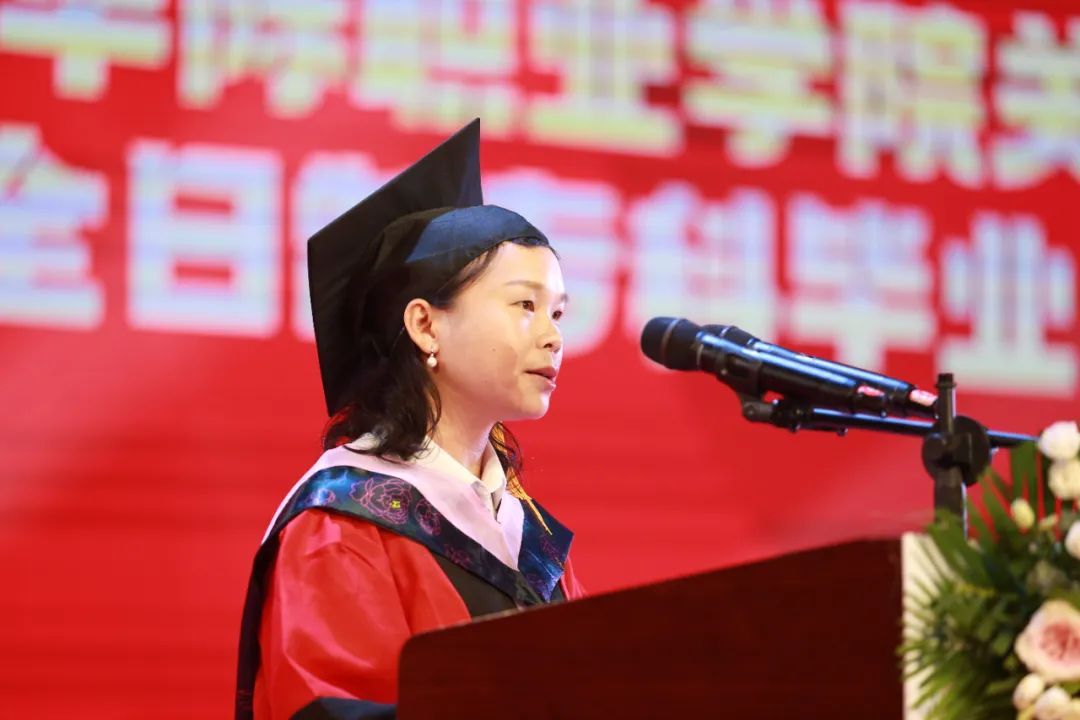 教師代表?xiàng)罘品粕吓_(tái)發(fā)言,作為一名青年教師,她以自己讀書的經(jīng)歷勉勵(lì)畢業(yè)生們要永遠(yuǎn)懷揣夢(mèng)想、勇攀高峰,保持對(duì)知識(shí)的渴望和獨(dú)立思考的能力;保持對(duì)生活的熱情,永遠(yuǎn)懷揣勇氣和熱情。最后,她祝愿同學(xué)們:愿你們征服高山,踏過泥濘,在人生的旅途中不斷求索,請(qǐng)用更開放,更包容,更向上的心態(tài)去擁抱這個(gè)世間的種種美好。