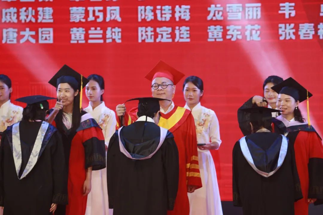 校長(zhǎng)鄒利斌及導(dǎo)師團(tuán)隊(duì)為本科畢業(yè)生撥穗,黨委書記黃家良、監(jiān)事會(huì)主席鐘偉、各二級(jí)學(xué)院院長(zhǎng)為獲獎(jiǎng)畢業(yè)生代表頒發(fā)榮譽(yù)證書。