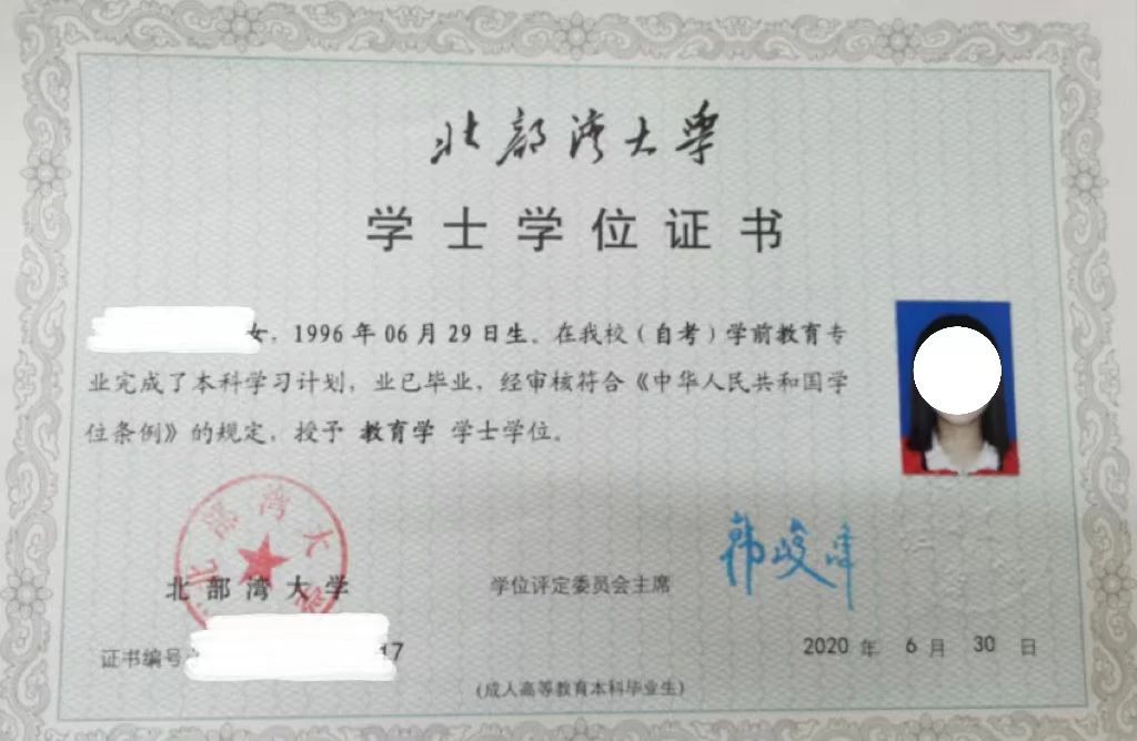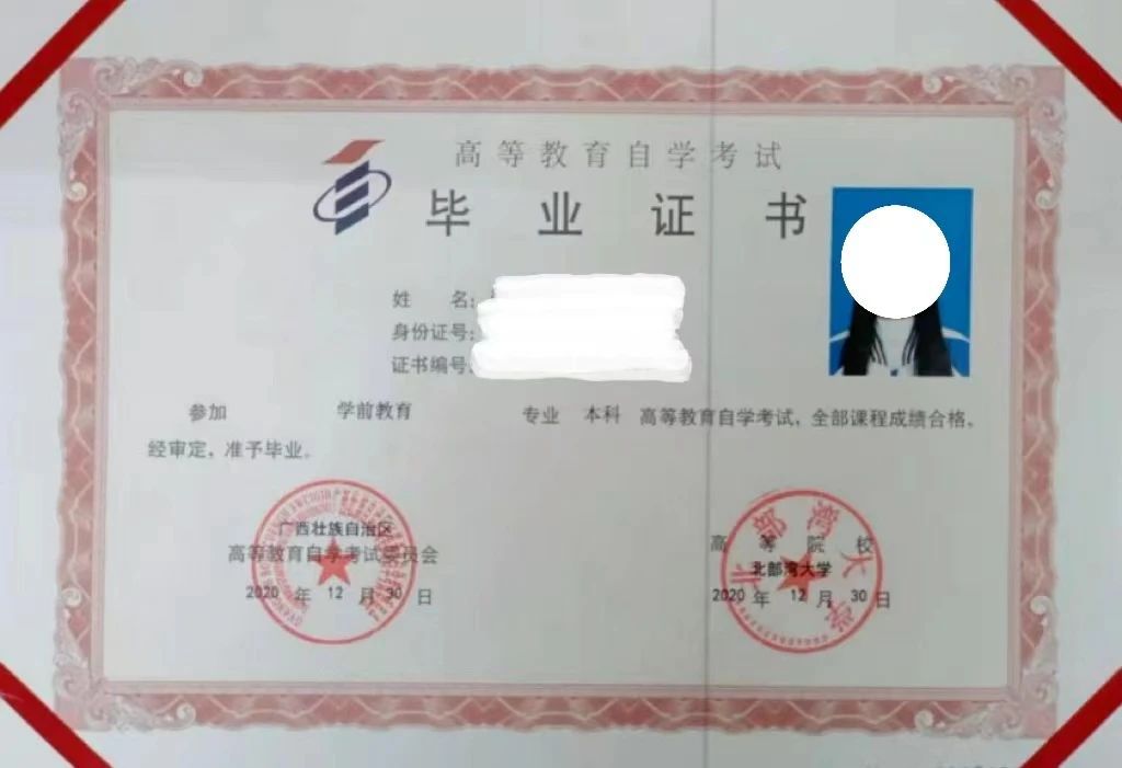 1.學生在校內就讀期間通過專本銜接專業(yè)計劃規(guī)定的全部課程,通過畢業(yè)論文答辯,可于專科畢業(yè)當年5月或11月向我校申請辦理自考本科畢業(yè)證。頒發(fā)國家高等教育自學考試本科文憑(文憑由國家教育部印制、廣西自考委和北部灣大學共同簽章,文憑上學信網注冊)國家承認其學歷,并實行電子注冊,與普通高校本科文憑具有同等效力。證書樣式如下: