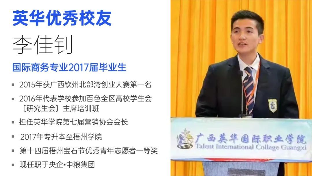 個人簡介:李佳釗,男,廣西玉林人,中共黨員。就讀于廣西英華國際職業(yè)學(xué)院,是國際商務(wù)專業(yè)2017屆畢業(yè)生,2015年獲廣西欽州北部灣創(chuàng)業(yè)大賽第一名,2016年代表學(xué)校參加百色全區(qū)高校學(xué)生會〔研究生會〕主席培訓(xùn)班,擔(dān)任英華學(xué)院第七屆營銷協(xié)會會長,2017年專升本至梧州學(xué)院,第十四屆梧州寶石節(jié)優(yōu)秀青年志愿者一等獎,現(xiàn)任職于央企?中糧集團(tuán)。
